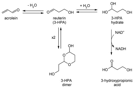 Reuterin (3-hydroxypropionaldehyde, 3-HPA) is an intermediate formed by Limosilactobacillus reuteri during the coversion of glycerol into 1,3-propanediol, with interesting antimicrobial activity against bacteria, fungi or even viruses [268,269,270]. In fact, it is not one compound, but a whole set, the so-called the reuterin system, which includes 3-HPA, 3-HPA dimer, acrolein, HPA hydrate, and 3-hydroxypropionic acid (Figure 3).