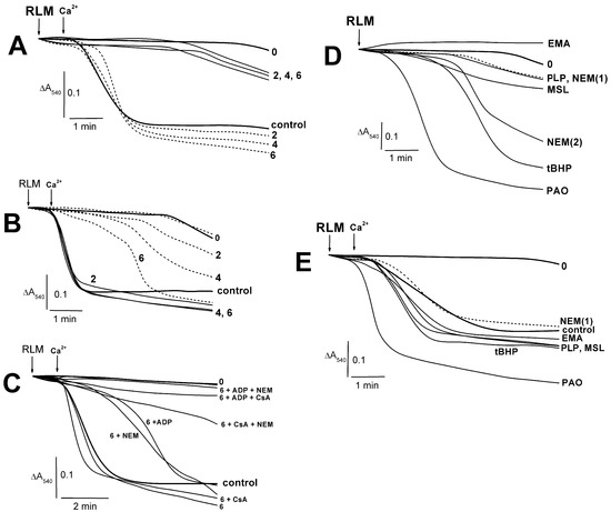 The inner membrane potential (ΔΨmito) induced by injection of 5 mM succinate into a medium was tested according to Waldmeier et al. [57]. The safranin O fluorescence intensity (arbitrary units) in the mitochondrial suspension was tested at 20 °C (Figure 4) using the microplate reader (CLARIOstar® Plus, BMG LABTECH, Ortenberg, Germany) at 485/590 nm wavelength (excitation/emission). The mitochondria (0.5 mg of protein/mL) were added into cells containing 300 μL of the medium with 20 mM TlNO3, 125 mM KNO3, 110 mM sucrose, 5 mM Tris-NO3 (pH 7.3), 1 mM Tris-Pi, 2 μM rotenone, 3 μM safranin O, and 1 μg/mL of oligomycin. ADP, CsA, PLP, EMA, PAO, tBHP, and MSL were injected into the medium before mitochondria (see Figure 4 legend). 5 mM succinate, 75 μM Ca2+, and 30 μM DNP was administrated into the medium after the mitochondria. The safranin O fluorescence change after the succinate injection was taken as 100% in control experiments free of the above additions (PLP, thiol reagents, ADP, CsA, and Ca2+). The other cases’ fluorescence values were calculated relative to this control. A parallel fourfold measurement for each 300 μl aliquot was made from three independent preparations.