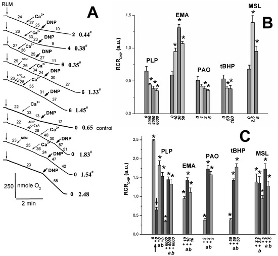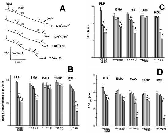 Effects of pyridoxal 5-phosphate and thiol reagents on oxygen consumption rates of rat liver mitochondria. Mitochondria (1.5 mg/mL of protein) were added into a medium containing 25 mM TlNO3, 125 mM KNO3, 100 mM sucrose, 5 mM Tris-NO3 (pH 7.3), 3 mM Tris-Pi, 3 mM Mg(NO3)2, 5 mM succinate, and 2 μM rotenone. Additions of mitochondria (RLM), 130 μM ADP (ADP), and 30 μM DNP (DNP) are correspondingly shown by vertical arrows, inclined arrows, and bold arrows. Oxygen consumption rates (nmole O2 min/mg of protein) are presented as numbers placed above experimental traces. The numbers to the right of the traces (A) show PLP (mM) concentrations. Numbers (A) in bold with the slash between them to the right of the traces, respectively, show values of the RCRADP and the RCRDNP (see the Section 4). The hash to the right of the latter numbers indicates that the difference between appropriate values of the RCRADP and the RCRDNP is statistically insignificant to the values found in experiments free of PLP. Representative traces from one of three independent experiments are presented. The ordinate (B) marks oxygen consumption rates (nmole O2 min/mg of protein) in state 3. The ordinates (C,D) show RCR and RCRDNP values. Numbers below the abscissa (B–D) indicate the concentration (μM) of thiol reagents (PLP, EMA, MSL, PAO, and tBHP). * shows significant differences from the control (“0” under the abscissa) experiments free of thiol reagents (p < 0.05).