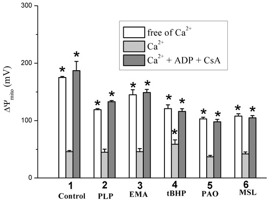 The influence of Ca2+, pyridoxal 5-phosphate, and thiol reagents on the inner membrane potential (ΔΨmito). Mitochondria (0.5 mg/mL of protein) were injected into the medium containing 20 mM TlNO3, 125 mM KNO3, 110 mM sucrose, 5 mM Tris-NO3 (pH 7.3), 1 mM Tris-Pi, 2 μM rotenone, 3 μM safranin O, and 1 μg/mL of oligomycin. The ordinate shows ΔΨmito change (mV) calculated from the safranine O fluorescence intensity (see Section 4). Numerals on the abscissa indicate the used reagents: control experiments (1), 6 mM PLP (2), 10 μM EMA (3), 100 μM tBHP (4), and 2 μM PAO (5). Besides, 500 μM ADP and 1 μM CsA (where indicated) were correspondingly added into the medium before mitochondria and Ca2+. Next, 75 μM Ca2+ was injected into the medium after mitochondria. * shows significant differences from the control experiments with Ca2+ and free of the reagents (p < 0.05).