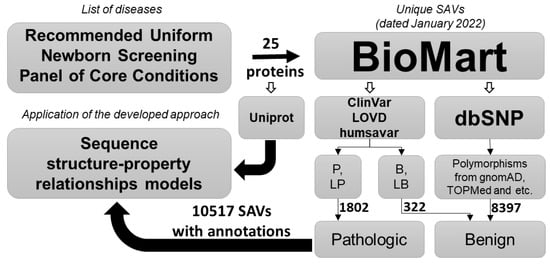 Of 32 core conditions from the ACOG screening panel, 24 monogenic diseases were chosen and 25 associated genes were found based on the OMIM database (accessed on 10 January 2022) (Table 1). The annotated data on missense variants related to the known genes, including clinical significance, variant supporting evidence, and protein allele were obtained from ClinVar [] (accessed on 14 January 2022), humsavar [] (accessed on 14 January 2022), LOVD [] (accessed on 12 January 2022), and dbSNP [] (accessed on 14 January 2022) databases using the BioMart data mining tool [] (accessed on 14 January 2022) (Figure 1). SAVs currently classified as pathogenic or likely pathogenic constituted the positive class, and substitutions that were interpreted as benign/likely benign, as well as all those that were in no way related to the phenotype/disease, constituted the negative class. Based on the known annotated SAVs and an appropriate protein sequence, we created the datasets containing fix length peptides (from 7 to 31 a.a. in the peptide) from the substitution and its a.a. surroundings in the form of structural formulas in the MOL V3000 format, plus their effect indicators (0-benign, 1-pathogenic). A similar algorithm was used earlier for the prediction of phosphorylation sites in proteins []. Amino acid surroundings were taken from canonical reference protein sequences from the UniProt [] (accessed on 3 February 2022) database by related positions.