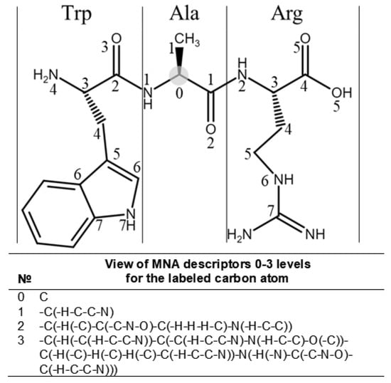 The example of 0–3 levels of MNA (Multilevel Neighborhoods of Atoms) descriptors is shown for the carbon atom of alanine in the polypeptide chain fragment. The numbers in the structural formula show the most distant atoms included in the descriptor of the related level of MNA descriptors. The appropriate descriptors of the chosen level are generated for all atoms in the structural formula. Such description helps to depict the linear structure of peptides completely and explicitly.