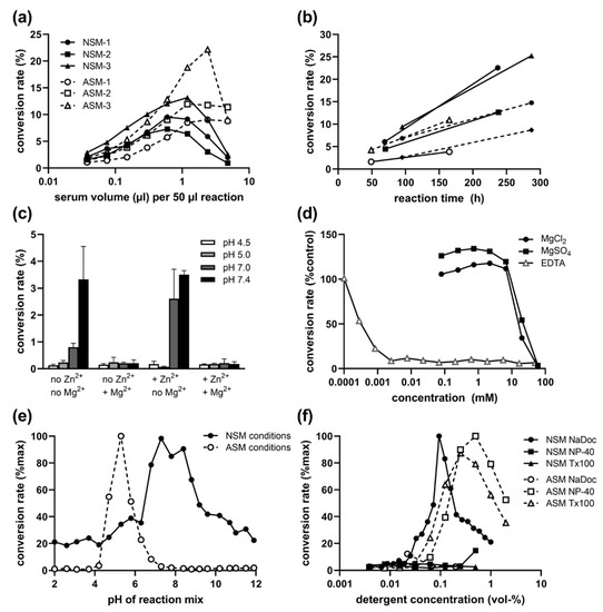 Optimization of reaction conditions for NSM in human serum samples. (a) Sample volume dependence for three representative samples (1–3) for ASM (16 h reaction time) and NSM (100 h). (b) Time dependence of serum NSM in different samples. (c) pH-dependent influence of 500 µM Zn2+ and 200 mM Mg2+ addition on ASM and NSM activity (reaction mix with 0.1% NaDoc). (d) Inhibition of serum NSM activity by Mg2+ and EDTA. (e) pH profile for ASM (NP-40, Zn2+) and NSM (NaDoc) conditions. (f) Influence of detergents for ASM and NSM conditions. NaDoc sodium deoxycholate, NP-40 Nonidet P-40, and Tx100 Triton X-100 detergents.