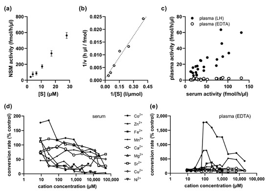 Kinetics and optimization of reaction conditions for EDTA-anticoagulated plasma samples. (a) Substrate–velocity graph for serum NSM activity. (b) Lineweaver–Burk plot with nonlinear regression line. (c) Correlation between NSM activities in serum and lithium heparin (LH) anticoagulated plasma versus nearly undetectable NSM activities in EDTA-anticoagulated plasma. (d) Mostly inhibitory influence of different divalent cations on NSM activity in serum samples. (e) Influence of cations on NSM activity in EDTA-anticoagulated plasma samples with the highest benefit from addition of cobalt ions.