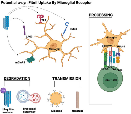 There are a variety of ways in which α-syn can enter microglia. Two prominent modes of entry have been reported to be phagocytosis and macropinocytosis. Several studies have indicated that microglia are able to phagocytose extracellular monomeric and fibrillar α-syn and that TLRs, which are receptors that have previously been described as important in microglial response to α-syn, are important in this phagocytic process [69,106]. Microglia have also been shown to engulf exosomes containing α-syn via macropinocytosis. Specifically, this has been suggested for α-syn-containing exosomes from oligodendrocytes [107].