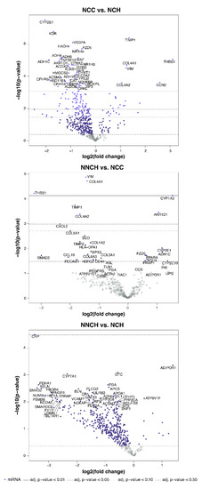Biological pathway analysis revealed several differentially regulated pathways between groups (Supplementary Table S2). When compared to NCH and NNCH, the NCC group showed decreased activity of many metabolic pathways. These latter include lipid metabolisms (acyl-CoA metabolism, cholesterol metabolism, lipid homeostasis, lipid hydroxylation, lipid metabolism, long-chain fatty acid biosynthetic process, fatty acid metabolic process, omega-hydroxylase P450 pathway, and regulation of lipid transport) and ethanol/alcohol/aldehyde metabolism (alcoholic catabolic process, aldehyde catabolic process, ethanol oxidation). In addition, there was an increased activity of ECM-related pathways (collagen biosynthetic process, ECM organization, and negative regulation of metallopeptidase activity), altered activity of bile acid metabolism and mitochondrial organization, as well as impaired retinoic acid, retinol, and steroid metabolism. In contrast, on the level of biological functions, there were no fundamental differences between NCH and NNCH.