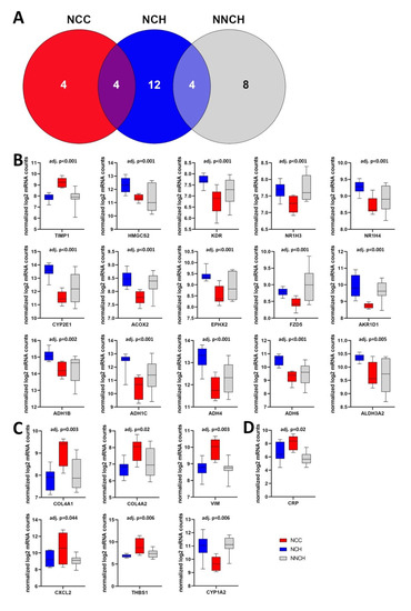 Out of 7 DEGs between NCC and NNCH, an increased expression was found for COL4A1, COL4A2, CXCL2 (C-X-C motif chemokine ligand 2), THBS1, and VIM whereas AKR1D1 and CYP1A2 showed a decreased expression (Figure 4C). Interestingly, only one single gene showed an altered expression between NCH and NNCH (i.e., increased expression of CRP (C-reactive protein) (Figure 4D).
