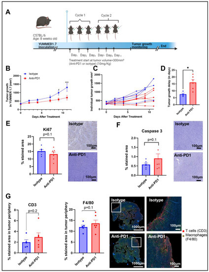 Anti-PD1 significantly delayed (p = 0.04) the progression of YUMMER1.7 melanoma xenografts compared to the isotype group, with a significant difference between groups upon day 9 after treatment initiation, as shown in Figure 1B,C. The growth delay was potentially induced by a combined effect of anti-PD1 treatment on tumor cell death and tumor cell proliferation, as shown by the trends observed with IHC of KI-67 and caspase-3, respectively, assessed after two cycles of immunotherapy (Figure 1D,E). At the same timepoint, the infiltration of T cells and macrophages showed an increasing trend in the anti-PD1 group at the edge of the tumors (Figure 1F). Of note, there was a lack of change in T cell infiltration and in the number of macrophages in the central regions of the tumors.