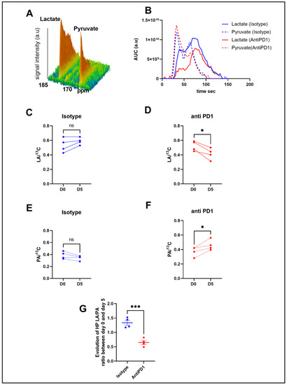 In order to determine metabolic differences between control and treated mice, we performed intravenous injections of HP [1-13C] pyruvate to mice bearing YUMMER1.7 xenografts to monitor, in vivo, the real-time exchange between [1-13C] pyruvate and [1-13C] lactate using in vivo 13C-MRS (Bruker Biospec, 11.7T). Figure 2B shows representative evolutions of 13C pyruvate and 13C lactate peaks over time, from which the area under the curve and ratios were calculated. Anti-PD1-treated tumors showed a significant decrease in the 13C lactate over the total 13C signal (LA/13C) ratio at day 5 compared to day 0, whereas the isotype control tumors did not show any significant change over time (Figure 2C,D). The anti-PD1-treated tumors also displayed a significant increase in the 13C pyruvate over total 13C signals (PA/13C) (Figure 2E,F). Consequently, a significant decrease was observed in the evolution of the ratio of hyperpolarized (HP) 13C lactate to 13C pyruvate (LA/PA) after treatment with anti-PD1 (Figure 2G). These data point out that HP 13C-pyruvate administered after one cycle of anti-PD1 treatment was able to detect metabolic changes before any significant change in tumor size could be observed.