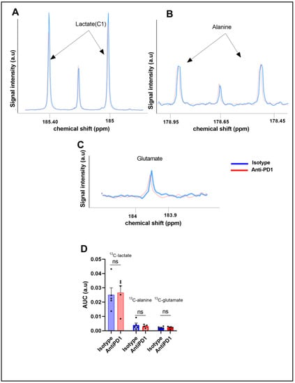 We did not observe any significant change in the steady-state levels of 13C-MRS ex vivo detectable metabolites in YUMMER1.7 xenografts, i.e., 13C-lactate, 13C-alanine, and 13C-glutamate, between the isotype and anti-PD1-treated tumors (Figure 3C).