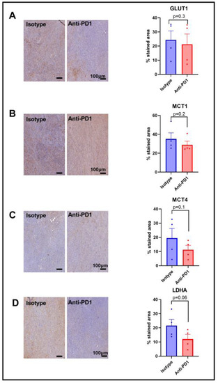 Since we observed a lower HP 13C lactate to 13C pyruvate ratio in response to anti-PD1 treatment, and since this ratio has been shown to be dependent on the LDH-A activity, as well as on the activity of the monocarboxylate transporters MCT-1 and MCT-4, and the glucose transporter GLUT-1, we assessed their expression via IHC after one cycle of anti-PD1 treatment to match the timing of the metabolic imaging experiments. A lack of change in GLUT-1 staining was observed in response to anti-PD1 treatment (Figure 4A), yet GLUT-4 was not assessed in this study. Further studies would be needed to better characterize the effect on glucose uptake. Similarly, the monocarboxylate transporters MCT-1 and MCT4 were not modified in response to anti-PD1 (Figure 4B,C). However, we observed a decreasing trend for LDH-A staining (p = 0.06, n = 4), showing a potential role in the ratio of decreased lactate to pyruvate (Figure 4D). Further, the flux through a pathway is not dictated by expression levels of the enzymes but rather by their activity, emphasizing the need for in vivo real-time dynamic flux measurements. In addition, the lack of change in these proteins at early time points excludes them as early markers of response to anti-PD1 therapy.