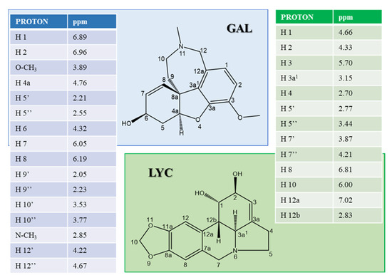 1H chemical shift values (ppm) of GAL (left) and LYC (right) protons. NMR 1D spectra were recorded on a solution of alkaloid 0.25 mM in 20 mM phosphate buffer, pH 7.5, T = 298 K.