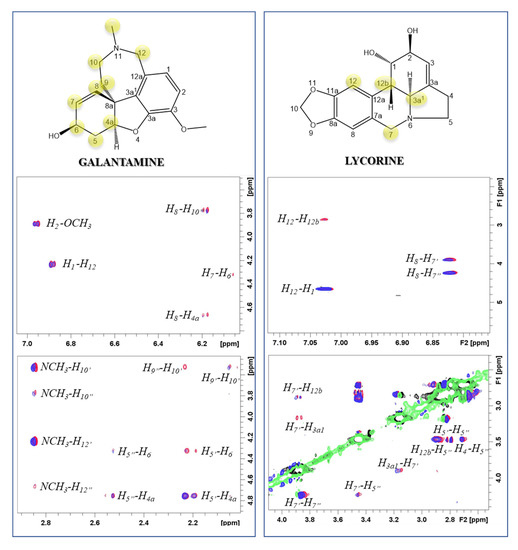 Selected regions of 1H-1H NOESY spectra of GAL (left) and LYC (right) in absence (red contours) and in presence of 0.3 equivalent (eqs.) of Aβ40 (blue contours). Alkaloid concentration 0.25 mM, Aβ40 concentration 0.083 mM, phosphate buffer 20 mM, pH 7.5, T = 298 K.