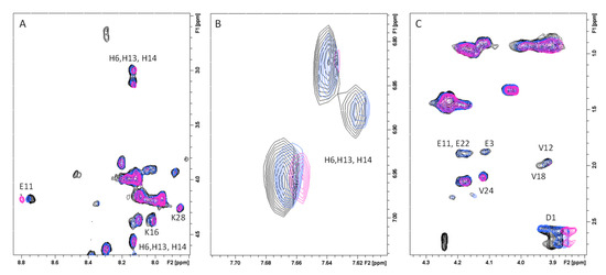 Selected regions, (A) fingerprint region; (B) aromatic region; (C) aliphatic region, of 1H-1H TOCSY spectra of Aβ40 in absence (magenta contours) and in presence of 0.8 eqs. of GAL (blue contours) and LYC (black contours). Aβ40 concentration 0.18 mM, EtOD(60)/H2O(40) (phosphate buffer 20 mM) mixture, T = 298 K.