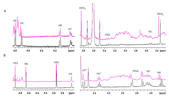 Selected regions of 1H spectra of (A). GAL and (B). LYC in absence (black lines) and in presence of 1.2 eqs. of Aβ40 (magenta lines). Alkaloid concentration 0.15 mM, Aβ40 concentration 0.18 mM EtOD(60)/H2O(40) (phosphate buffer 20 mM) mixture, T = 298 K.