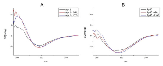CD spectra of Aβ42 (A) and Aβ40 (B) in absence (black lines) and in presence of 0.8 GAL (red lines) and LYC (blue lines) eqs. Aβ42/Aβ40 concentration 3 µM, GAL concentration 2.4 µM, LYC concentration 2.4 µM, phosphate buffer 1 mM, T = 298 K.
