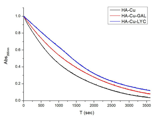 UV-Vis kinetic curve of ascorbate oxidation by Cu(II) ions in absence (black lines) and in presence of equimolar GAL (red lines) and LYC (blue lines) concentrations. Ascorbate concentration 50 µM, 200:1 ascorbate:copper(II) ratio, phosphate buffer 3 mM solution, pH 7.5, T = 298 K.