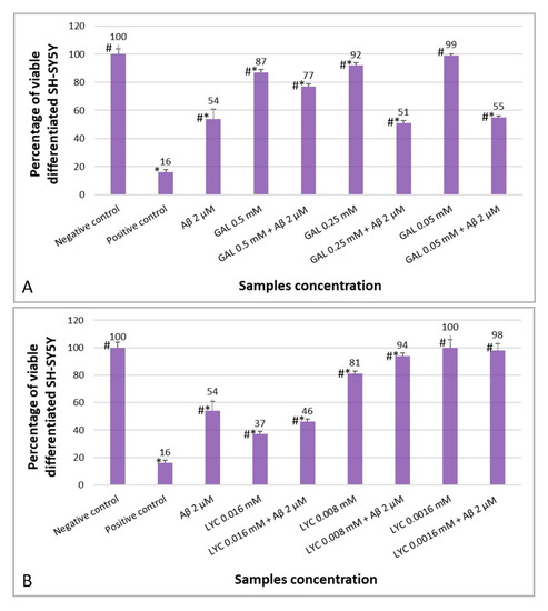 The cytotoxicity of different concentrations of Aβ (2 and 5 µM), LYC (16, 8, 1.6 µM) and GAL (500, 250, 50 µM) towards differentiated SH-SY5Y cells was evaluated in order to select the most suitable values to be tested with neuronal cells. The concentration of Aβ were chosen considering the data reported by Stroud et al. demonstrating that the amyloid peptide was toxic to HeLa and PC-12 neuronal cells at concentrations as low as 2.25 μg/mL [86]. Then, the cytotoxicity of LYC-Aβ and GAL-Aβ was studied. In particular, the following concentrations were analyzed: LYC 16 µM + Aβ 2 µM, LYC 8 µM + Aβ 2 µM, LYC 1.6 µM + Aβ 2 µM, GAL 500 µM + Aβ 2 µM, GAL 250 µM + Aβ 2 µM, GAL 50 µM + Aβ 2 µM. The stock solution of Aβ was prepared in Et-OH 60%, those of GAL and LYC in distilled water, and then properly diluted with DM 3 until the desired concentration to be tested with the cells was obtained.