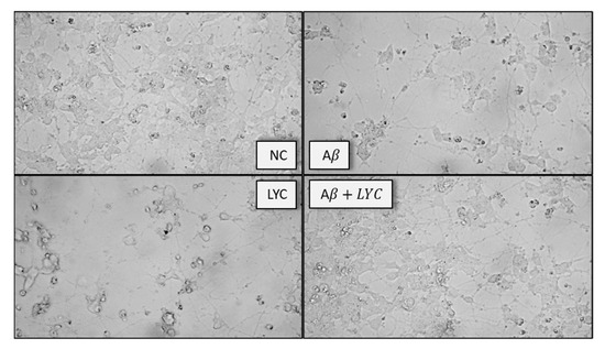 In our study, SH-SY5Y differentiation was accomplished by using the procedure reported by Shipley et al. developed to appropriately differentiate cells into neurons and to obtain the best possible representation of in vivo neuronal model [81]. Our results indicated that the vitality and morphology of SH-SY5Y cells are strongly altered upon Aβ42 exposure (Figure 8). Aβ42 is capable of wiping out most of the neuronal processes visible in healthy cells (negative control). In a similar way, both the cytotoxic and non-cytotoxic alkaloid concentrations reduce the finger-like projections connecting SH-SY5Y cells, as reported in Figure 8, showing the cellular morphology upon LYC (8 μM) treatments.