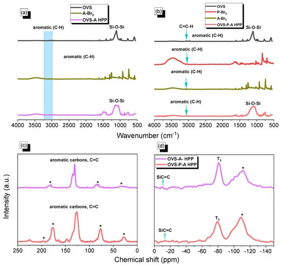 (a,b) FTIR of OVS, A-Br2, P-Br4, OVS-A HPP and OVS-P-A HPP, (c) 13C and (d) 29Si NMR spectra of the OVS-A HPP and OVS-P-A HPP. * is the side band of solid-state nuclear magnetic resonance spectroscopy (NMR).