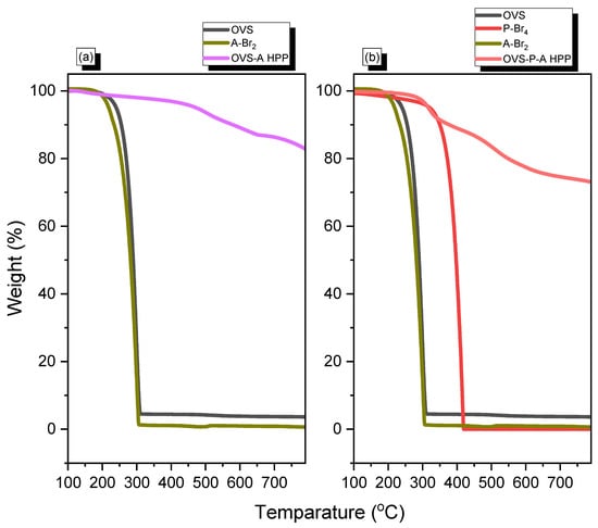 TGA analysis of (a) OVS, A-Br2, OVS-A HPP and (b) OVS, P-Br4, A-Br2, OVS-P-A HPP.