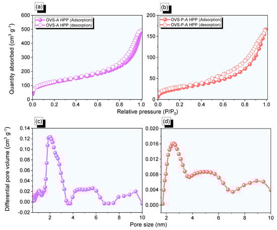 (a,b) N2 isotherms profiles and (c,d) pore diameter size of the (a,c) OVS-A HPP and (b,d) OVS-P-A HPP.