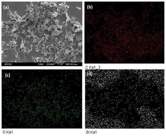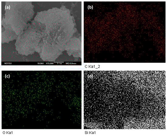 SEM images and their corresponding element mapping for (a–d) OVS-P-A HPP.