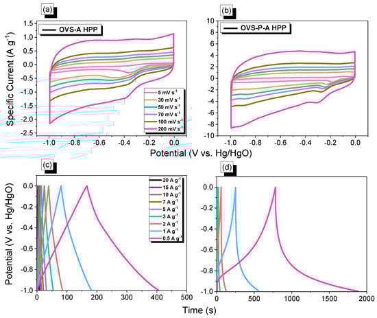 The electrochemical properties were investigated in a three-electrode cell (system), using the techniques for cyclic voltammetry (CV) and galvanostatic charge-discharge (GCD) in 1 M of KOH aqueous solution (Figure 7a–d). The CV profiles of OVS-A HPP and OVS-P-A HPP were measured at different scan rates (200 to 5 mV s−1) and potential windows (−1 to 0 V) (Figure 7a,b). Both the samples experienced rectangular CV curves, with humps suggesting that this capacitive behavior occurred mostly from electric double-layer capacitance (EDLC) and pseudocapacitance []. Increasing the scan rate led to a higher specific current without changing the morphologies of the CV profiles, validating the stabilities and the efficient electron mobility []. The GCD curves of OVS-A HPP and OVS-P-A HPP were measured at different specific currents (0.5 to 20 A g−1) (Figure 7c,d). The cathodic peaks can be seen for both electrode materials in CV plots, due to the presence of heteroatoms (O and Si) in the OVS unit and electron-rich phenyl groups in the anthracene and pyrene [,]. The GCD curve of OVS-A HPP showed an approximately rectangular curve with a small bend, demonstrating the combined effects of pseudocapacitance and EDLC []. The GCD curves of OVS-P-A HPP demonstrated the traditional characteristics of a pseudocapacitance with great symmetry, suggesting a strong electrochemical performance []. The discharge time of OVS-P-A HPP was higher and more prominent than OVS-A HPP (Figure 7c,d), showing its comparatively high capacitance.