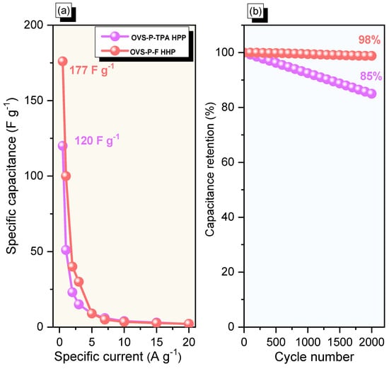The specific capacitances of OVS-A HPP and OVS-P-A HPP, calculated from GCD curves, were 120 F g−1 (calculated by using Equation (S1)) and 177 F g–1 (calculated by using Equation (S2)), respectively, at 0.5 A g−1 (Figure 8a). The difference in the specific capacitance between the OVS-A HPP and OVS-P-A HPP was very pronounced when the specific current was increased to 20 A g−1, experiencing the values of 2 F g–1 and 2.5 F g–1, respectively. As a result, the overall CV and GCD analysis showed that OVS-P-A HPP showed higher electrochemical properties than OVS-A HPP. The chemical structure of OVS-P-A HPP contains pyrene groups with more electron-rich phenyl rings, allowing the electrolytes to reach the electrode surface more quickly than in the OVS-A HPP; this was responsible for its comparatively remarkable performance []. The Faradaic reaction between anthracene and the π-conjugated framework may also be responsible for OVS-P-A HPP’s excellent performance. When the specific current was increased from 0.5 to 20 A g−1, the specific capacitance of OVS-A HPP and OVS-P-A HPP declined, most likely because there was not enough time for ion mobility at such high specific currents []. The specific capacitance retention of OVS-A HPP and OVS-P-A HPP was also measured at 2000 cycles from GCD analysis (Figure 8b). The OVS-A HPP and OVS-P-A HPP exhibited excellent stability, with a specific capacitance retention of 85% and 98%, respectively. Additionally, the electrochemical performance of OVS-A HPP and OVS-P-A HPP was exceptional when compared to previously reported porous polymers and composite materials (Table S1) [,,,,,,,].