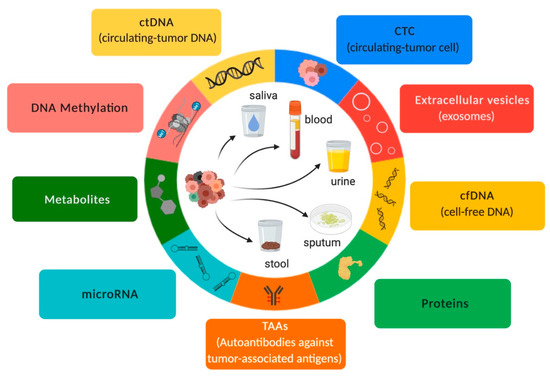 Body fluids such as plasma, sputum, saliva, urine, stool, cerebrospinal fluid, and pleural effusions, among others, are suitable sources for detecting diagnostic, prognostic, and predictive biomarkers for NSCLC [21,29,30,31,32,33]. As a result, liquid biopsy has been employed due to its minimally invasive sample procurement. However, it is important to point out that not all body fluids are collected by a minimally invasive sample procurement (e.g., cerebrospinal fluid). Thus, the type of body fluid selected for liquid biopsy must be carefully chosen based on the type of cancer, especially because some body fluids do not properly represent tumor origin (Table 1 and Figure 1). Moreover, the most important benefit of liquid biopsy is the minimally invasive sample procurement, and we should avail this advantage.