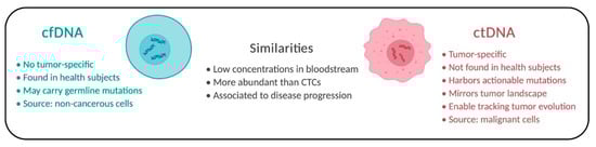 Comparison of cfDNA and ctDNA. Individual aspects and similarities of both molecules are described.