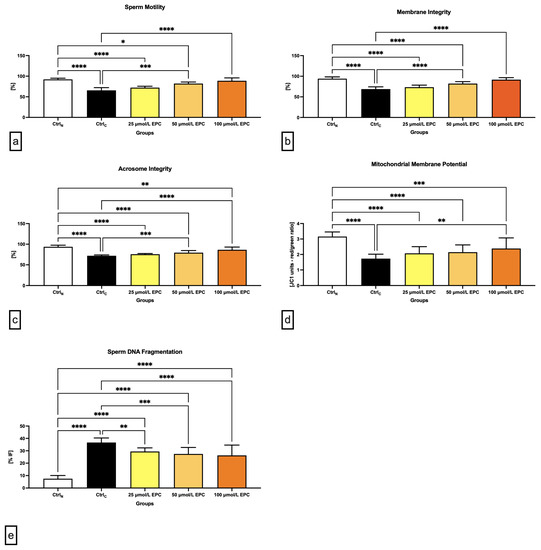 Thermal shock also exhibited negative effects on the sperm acrosome integrity. When compared to CtrlN, a significant decrease of the integrity of acrosome was recorded in CtrlC as well as in experimental groups supplemented with 25 μmol/L EPC and 50 μmol/L EPC (p < 0.0001; Figure 1c). Inversely, a significant improvement of the acrosome stability in comparison to CtrlC was observed following the administration of 100 μmol/L EPC (p < 0.0001).