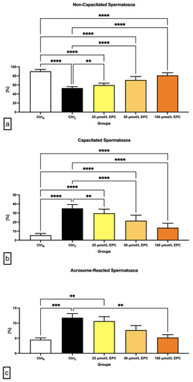 The lowest proportion of non-capacitated spermatozoa (“F”-pattern) was recorded in the cryopreserved control, which was significantly different in comparison with the native control (p < 0.0001; Figure 2a). A significant decrease of non-capacitated spermatozoa was also observed in all experimental groups containing EPC in contrast to CtrlN (p < 0.0001). On the other hand, supplementation of all EPC doses led to at least partial prevention of the loss of non-capacitated spermatozoa when compared to the control group cryopreserved in the absence of EPC (p < 0.01 with respect to 25 μmol/L EPC; p < 0.0001 in case of 50 μmol/L EPC and 100 μmol/L EPC).