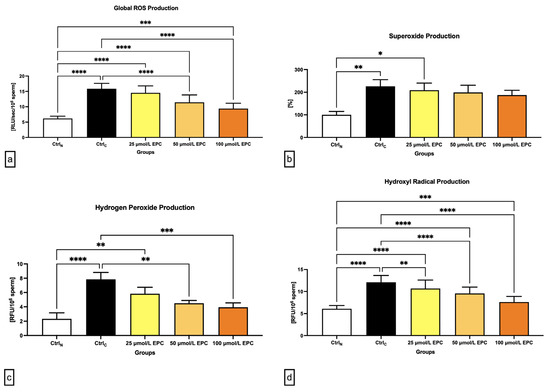 In case of the superoxide (O2-•) production, a significant rise of its levels was observed in the CtrlC group and the experimental groups containing 25 μmol/L EPC in comparison to the native control (p < 0.01; Figure 3b). No significant differences among the experimental groups and the cryopreserved control were detected although a dose-dependent decrease of O2-• concentrations was observed following EPC administration.