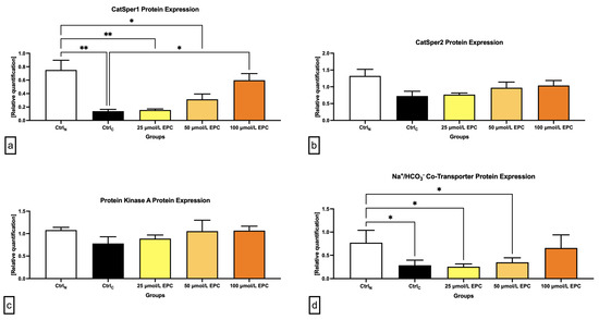 No significant changes in the CatSper2 (Figure 4 and Figure 5b) and PKA (Figure 4 and Figure 5c) protein expression were detected when comparing the pre-established groups among each other although both proteins were notably underexpressed in the CtrlC group. A dose-dependent increase of the expression levels of both proteins was recorded in the experimental groups supplemented with EPC.