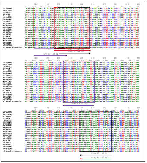 Location of primers in the potato leafroll virus (PLRV) coat protein gene. Free web-based Bio-edit software (https://www.bioinformatics.nl/cgi-bin/primer3plus/primer3plus.cgi/ (accessed on 30 June 2021)) was used to run a ClustalW multiple sequence alignment. The present study followed the manufacturer’s instructions, and primers in triplicate were generated using a full-coat protein gene by specifically targeting conserved regions. NCBI’s GenBank database (http://www.ncbi.nlm.nih.gov/blast (accessed on 30 June 2021)) provided the sequences (Accessions AF453388, EU717546, AY307123, X77324, JQ420903, LC501445, FJ481109, MK445319, MH937415, MF062487, KR051205, KP090166, EF063711, D13954, KC456052, MG356502, KU586454 and GU256062). The boxes denote primer regions, while arrows have been placed to specify the primer positions for reverse transcription-recombinase polymerase amplification (RT-RPA).