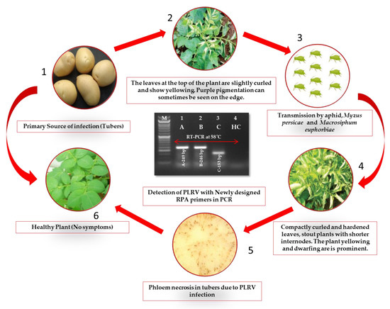 The potato (Solanum tuberosum L.) is regarded as the most important non-cereal crop in the world. The potato is believed to have its origin 8000 years ago in the high hills of the Andean Mountains of South America and it has become popular worldwide [1,2,3,4]. The United Nations have designated potatoes as a food that can potentially secure global food security [5,6]. Potatoes are a very nutritious crop and are regarded as a futuristic food for meeting present needs and can grow in almost any environment [7,8,9,10,11]. Potatoes are easier to cultivate and more productive than many other vegetables, and the harvested tubers can be further sown [12,13,14,15]. In 2020, the FAO estimated that more than 359 million metric tonnes of potatoes would be harvested from more than 17 million hectares of land. The present scenario of potatoes in India in terms of area, production and productivity was reported to be 2.20 million hectares, 53.58 million metric tonnes and 24.35 t/ha, respectively [12,16]. The potato is cultivated mainly for its quality tubers which are consumed in various forms of culinary items. However, various abiotic factors highly associated with the reduction in production and productivity have been suggested, including multiple types of fungi, bacteria and viruses capable of easily infecting potato crops. Viruses are the leading cause of seed potato degeneration and certification rejection. To identify these viruses in the lab and field conditions, sensitive, precise and cheaper methods must be developed which might be beneficial for the seed industry as well as farmers. Due to the high moisture content, tubers are frequently exposed to a variety of infectious viruses, with the potato leafroll virus (PLRV), potato virus Y (PVY), potato virus X (PVX) and potato virus S (PVS) being the most economically significant [16,17,18,19]. PLRV (genus Polerovirus, family Luteoviridae) has emerged as a global threat in healthy seed potato production systems among the more than 50 viruses that impact the potato crop globally [12,20]. PLRV has small, isometric virions that are predominantly confined to the phloem of infected plants (23–25 nm dia). It possesses a monopartite, single-stranded, non-enveloped genome with a 5882-nucleotide positive sense RNA. According to one estimate, this virus is responsible for 20 million tonnes of global crop loss [6,12,20,21]. PLRV activity is often indicated by the presence of symptoms such as upright and consistent rolling leaves, leathery leaves with progressive yellowing and reddening, significant plant height reduction, necrotic phloem tissue with prominent decaying spots sideways of leaf veins and ultimately necrosis in the potato tubers. However, the net necrosis of potato tubers depends upon the degree of infection and might increase during storage. A crimson or violet staining is visible on the leaf margins and undersides of certain cultivars. In general, potato leaf roll disease is transmitted by aphid vectors in a persistent, circulative and non-propagative manner [5,12,20,21]. However, pollen, seeds and mechanical inoculation are not transmission methods [12,18]. Virulent aphids from distant or neighbouring fields and unhealthy volunteer plants that develop from infected tubers generally cause initial infections. Infected potato plants will produce tubers infected with PLRV. If infected tubers are planted, contaminated plants will thrive. The green peach aphid is the most efficient and essential PLRV vector (Myzus persicae), but the virus is also carried by Aphis gossypii. Macrosiphum euphorbiae, which spreads to potato strains less successfully [21,22].