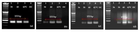 Optimization of one-step reverse transcription-recombinase polymerase amplification (RT-RPA) for potato leafroll virus (PLRV) detection using primer pair C (LRRPAF3/R3) at different temperature regimes (38, 40 and 42 °C). The gel-electrophoresis generated images depict the RT-RPA amplified amplicons in a heating block (a,c) and in a water bath (b,d). The purified RNA as the template was used in RT-RPA in (a,b); whereas the simple RNA has been used for (c,d). Within each gel documentation image, three lanes (1, 2 and 3) depict the PLRV-infected samples along with a 50 bp ladder (Lane M). Lane 5 (c,d) denotes the healthy control.