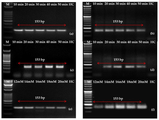 To standardize the protocol experiments further, experiments regarding the minimum time requirement and optimum concentration were performed. An incubation time of 10 min was reported to be sufficient for the detection of PLRV in two-step RT-RPA; however, 20–30 min incubation was required for one-step RT-RPA, which can be seen in Figure 5. Subsequently, the appropriate concentration volume of magnesium acetate ranged from 12 to 20 mM; however, 14 mM was chosen for one-step RT-RPA optimization for better results.