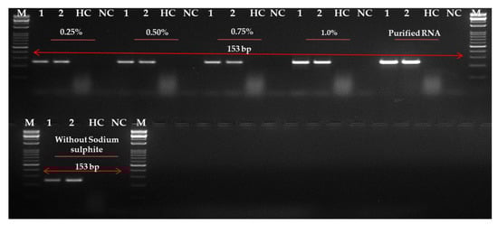 Although in a previous report [28] the cellular disc paper-based method was used to detect PLRV in leaves without the use of sodium sulphite salt (Figure 6), our results were conducted on a commercial kit. However, to improve RNA concentration and quality, an experiment was conducted to see the effect of different recommended concentrations of sodium sulphite on the reaction. The use of 0.75–1.0% sodium sulphite in the extraction buffer was reported to increase the quality of RNA extracted from leaves (Figure 6). In our report, it was suggested that the best amplification could be seen in the leaves in an extraction buffer of 1.0% sodium sulphite. A lower concentration of sodium sulphite (0.25–0.5%) also provided an amplification, but the band observed was faint or non-specific. However, in a further experiment, the use of 1.0% sodium sulphite and cellular disc paper was successful in the RNA extraction of potato leaves. However, the method was less sensitive in the detection of PLRV in tubers (data not shown).