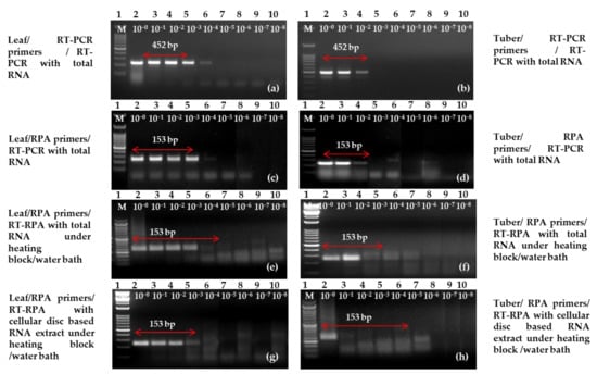 Reverse transcription-polymerase chain reaction (RT-PCR) and reverse transcription-recombinase polymerase amplification (RT-RPA) amplified amplicons at dilutions levels ranging from 10−0 to 10−8 detect potato leafroll virus (PLRV). One-step RT-PCR with previously reported primers [12] on purified RNA performed with (a) infected leaves and (b) infected tubers. One-step RT-PCR with optimized primer LRRPAF3/R3 on purified RNA in (c) infected leaves and (d) infected tubers. One-step RT-RPA with newly optimized primer LRRPAF3/R3 on purified total RNA in (e) infected leaves and (f) infected tubers. One-step RT-RPA with optimized primer LRRPAF3/R3 on cellular disc-mediated RNA extract in (g) infected leaves and (h) infected tubers. Lane M (a–h): 50 bp DNA ladder.