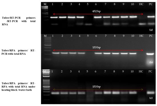 Optimization of reverse-transcription recombinase polymerase amplification/reverse transcription-polymerase chain reaction (RT-RPA/RT-PCR) for successful detection in potato leafroll virus (PLRV) infected tubers. (a) One-step RT-PCR performed with previously reported primers [12] on purified RNA; (b) one-step RT-RPA with newly optimized primer LRRPAF3/R3 on purified total RNA; (c) one-step RT-RPA with optimized primer LRRPAF3/R3 on cellular disc-mediated RNA extract. Lane M (a–c): 50 bp DNA ladder, lanes 1–15: potato leaf samples, PC: known positive, HC: healthy, NC; negative (water). In all three gel images, a 50 bp DNA marker (Lane M) has been used. The amplicons of infected tuber samples represent lane 1–10 along with a positive control (PC) and a healthy control (HC).