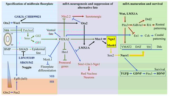 Many of the transcription factors that drive the ventral midbrain floor plate development (i.e., Otx2, Wnt1, FGF8, Shh, and FOXA2) also play integral roles in mDA neuron specification. For instance, Wnt1, FGF8, and Shh are all required for the ectopic induction of mDA neurons [30]. Loss of Wnt1 will result in the loss of proliferating mDA progenitors, which highlights the crucial role Wnt1 plays in the specification, differentiation, and maintenance of mDA progenitors [30]. Wnt1 at the midbrain floor plate ensures the mDA fate via activating the Otx2-Wnt1-LMX1A/Msx1 pathway [18]. Wnt1 also maintains Otx2 expression that is required to repress Nkx2.2, a product of Shh from the floorplate that promotes serotonergic fate [30]. Failure to repress Nkx2.2 in the midbrain will lead to the generation of serotonergic, rather than DA neurons [31]. In addition to suppressing alternative neuronal fates, Otx2 and its downstream factor LMX1A function as important determinants of mDA fate [32,33]. Indeed, ectopic expression of LMX1A is sufficient to induce mDA neurons in chick embryos [34]. LMX1A first induces the expression of Msx1, and together they activate the proneural factor Ngn2 (neurogenin 2) and the basic-helix-loop-helix family, Mash1 (mouse achaete-schute homolog 1) that further drive mDA neurogenesis [34,35]. Ngn2 activation results in Sox2-positive progenitors that mature into Nurr1-positive neurons and eventually differentiate into tyrosine hydroxlase-positive (TH+) mDA neurons [36]. At the same time, LMX1A also coordinates the specification of mDA neurons by cooperating with FOXA2 [33]. On top of determining a ventral midbrain fate, FOXA2 is key to DA neuron specification. FOXA2-null embryos do not survive past the embryonic age of 10.5 days, whereas FOXA2 overexpression results in a four times increase in the number of TH+ cells [17]. FOXA2 induces the differentiation of both the red nucleus and DA neurons in the SNpc, and LMX1A selects for the DA fate by repressing the red nucleus Sim1-Lhx1-Ngn1 pathway [33]. In addition, LMX1A assists FOXA2 in developing the floor plate by repressing Nkx6.1 that inhibits floor plate differentiation [33]. FOXA2 can also drive DA fate by collaborating with Otx2 in inhibiting Nkx2.2 that otherwise promotes the development of serotonergic neurons [37]. Finally, as mentioned above, mDA neurogenesis is further driven by proneural factors Mash1 and Ngn2 [38,39], with Mash1 capable of partially compensating for the loss of Ngn2 [36]. Supporting this, a reported study [36] revealed that the loss of Ngn2 decreased the mDA neuronal population by 50% in wildtype mice, with a further decrease in mDA neuron numbers upon the deletion of Mash1. As can be appreciated from Figure 1, Ngn2/Mash1 is a convergent point for the Otx2-Wnt1-LMX1A/Msx1 pathway [39]. FOXA2 also converges on Ngn2/Mash1 via the Msx1-LMX1A pathway (Figure 1). In parallel, FOXA2 can directly regulate Ferd3l, which represses Hes1 that suppresses proneural genes to promote proneural development [32]. Finally, although Ngn2 is critical for mDA neurogenesis, it is unable to specify the terminal differentiation into TH+ mDA neurons [40], which requires other factors as discussed below.