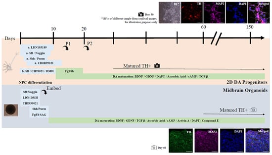 - Gantner, C.W.; Cota-Coronado, A.; Thompson, L.H.; Parish, C.L. An Optimized Protocol for the Generation of Midbrain Dopamine Neurons under Defined Conditions. STAR Protoc. 2020, 1, 100065. [Google Scholar] [CrossRef] [PubMed]