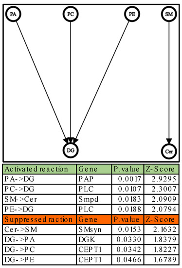 As can be observed from Figure 1, most phospholipid classes (PA, PC, and PE) are being transformed into DG; the other transformation that can be observed is SM to Cer. It should be highlighted that all these transformations can be considered as a degradation towards less complex lipids. This formation of DG from other phospholipids can be the result of enhanced activation of phospholipase enzymes such as phospholipase C (PLC) and phosphatidate phosphatase (PAP) in HbS patients compared to WT [47]. However, it could be possible that there is a malfunction in the reverse pathway that transforms the DG into other phospholipids in the HbS patients. These pathways are carried out by a group of phosphotransferase enzymes such as choline/ethanolamine phosphotransferase 1 (CEPT1) and diacylglycerol kinase (DGK). These irregular activities in pathways could explain the significant increase in DG in HbS patients. In fact, many studies have shown that an altered concentration of DG has serious effects associated with diseases such as cancer, diabetes, immune system disorders, and Alzheimer’s disease [48]; other studies have reported the ability of DG to modify the activity of membrane-bound enzymes such as protein kinase C and phospholipases, which are essential for the metabolism of other lipids [49].