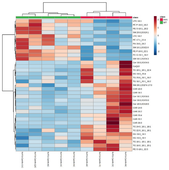 The heatmap in Figure 3 shows that some molecules species of CAR, TG, DG, Cer, and CoQ10 are over-expressed in the HbS group; however, several phospholipid and SM species are under-expressed.
