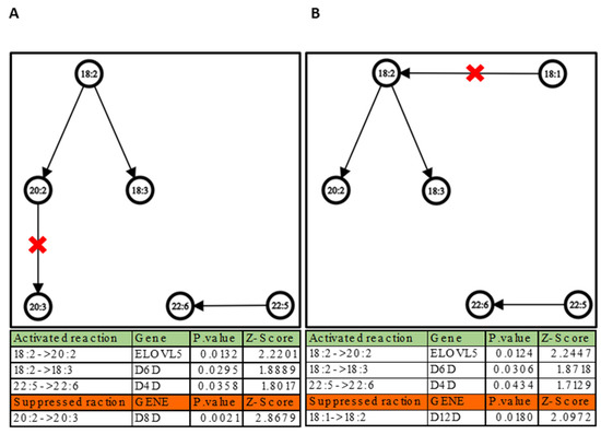 With the data in Table 1, it was also possible to conduct additional studies on the interactions between the lipid classes using a well-known lipid class pathway [43,44,45]. The network transformation analysis was performed by studying the ratio of product/reagent weights for each sample. The average of the weights obtained in Hbs was compared to that of the WT samples to determine which reaction is activated or suppressed as indicated by A. Nguyen et al. [46]. This data cannot be directly deduced from the absolute abundances of the single lipid classes.
