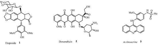 Topo II inhibitors are classically divided into catalytic inhibitors and topo II poisons, according to their mechanism of action. Topo II catalytic inhibitors destroy cancer cells through the inhibitions of Topo II enzymatic activities, thus preventing the formation of Topo II–DNA complex without increasing DNA cleavage, via the mechanisms of action that include interfering with DNA binding, inhibiting cleavage of the DNA molecule, ATP hydrolysis, and binding to the ATP binding site. Topo II poisons destroy cancer cells by increasing the amount of covalent Topo II–DNA complexes and preventing the religation of the cleaved DNA strands, thus forming unwanted double strand breaks that are toxic to the cells, and, subsequently, leading to apoptosis. Based on the type of DNA binding strategies, Topo II poisons could be DNA-intercalating agents, which have a weak interaction with DNA and function by insnaring Topo II–DNA complexes, or non-DNA-intercalating agents, which can reversibly incorporate themselves into the DNA base pairs and hinder the activity of enzymes responsible for DNA replication and transcription processes. Topo II poisons include drugs such as etoposide 1, doxorubicin 2, and m-amsacrine 3 [,,], as shown in Figure 1. Most of the first-line agents for treating cancer are Topo II poisons, such as etoposide (non-intercalator), doxorubicin, and m-amsacrine (intercalator) [,,,,]. However, a study by Ketron et al. [] indicated that the activity and specificity of m-amsa lies in the head group 4′-amino-methanesulfon-m-anisidide. The DNA intercalation of m-amsa is used primarily to enhance the affinity of the drug for Topo II–DNA cleavage complex. However, due to side effects, such as risk of cardiotoxicity and secondary malignancies, that are often encountered during the use of DNA poisonous drugs, research is now shifting towards the discovery of Topo II catalytic inhibitors, which have good pharmacokinetics profiles.