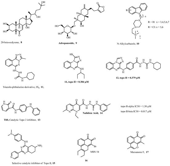 Ellipticine, an alkaloid from Ochrosia elliptica labil, has been previously indicated for the treatment of metastatic breast cancer, and several carbazole derivatives based on Ellipticine have shown inhibitory activities against TopoI and TopoII [,,]. In Italy, Saturnino et al. [] reported 2-(4-((3-Chloro-9H-carbazol-9-yl)pentyl)piperazin-1-yl)-N,N,N-trimethylethanammonium iodide 10 as a good inhibitor of TopoII and that it showed antiproliferative activity on breast cancer cells, causing apoptosis by activating the caspase pathway. Additionally, 7-((2-(dimethylamino)ethyl)amino)indolo[2,1-b]quinazoline-6,12-dione 26, which was derived from trypthantrin, a natural alkaloidal compound containing a basic indoloquinazoline moiety, has been reported for its inhibitory activity against TopoII, and has shown properties such as high water solubility and antiproliferative activity on acute leukemia, colon, and breast cancer cell lines []. Garcinol, a polyisoprenylated benzophenone isolated from the Garcinia genus, has been reported to inhibit eukaryotic TopoI and TopoII at concentrations comparable to that of the standard drug etoposide []. Mai et al. [] in China investigated 9-bromo-2,3-diethylbenzo[de]chromene-7,8-dione (MSN54) (16), a derivative of Mansonone F (MsF) [], and they found it to be a non-intercalative catalytic inhibitor of TopoIIα. MsF (17) is a phytoalexin obtained from Helicteres Angustifolia L. with a rare sesquiterpene o-quinone structure and possesses anti-tumor activity, and its derivatives have shown strong inhibitory activity on TopoII [].