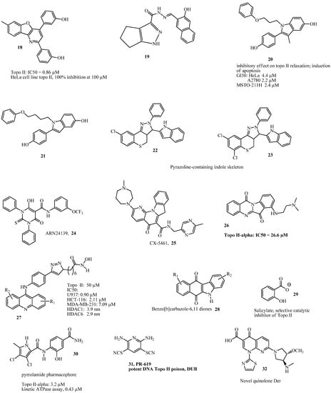 Ziga et al. [] reported 30 as a novel ATP-competitive inhibitor of hDNA topo IIα containing pyrrolamide pharmacophore. The compound showed high kinetic ATPase activity (IC50 0.43 µM). In another study, Kamila et al. [] reported that 32, a quinolone derivative, is being used in phase I and II clinical trials in combination with azacitidine and infusional cytabarin. Recently, Sisodiya et al. [] reported the synthesis of benzo-fused carbazolequinone derivatives that contain both indole and quinone moieties that are found in numerous drugs, including natural products. Compound 28 displayed significant apoptotic antiproliferation in cancer cells with cell cycle arrest at the S phase. It also inhibited topoIIα with more efficiency compared to etoposide. The structures of topoisomerase II inhibitors (4–17 and 18–32) are shown in Figure 2 and Figure 3.